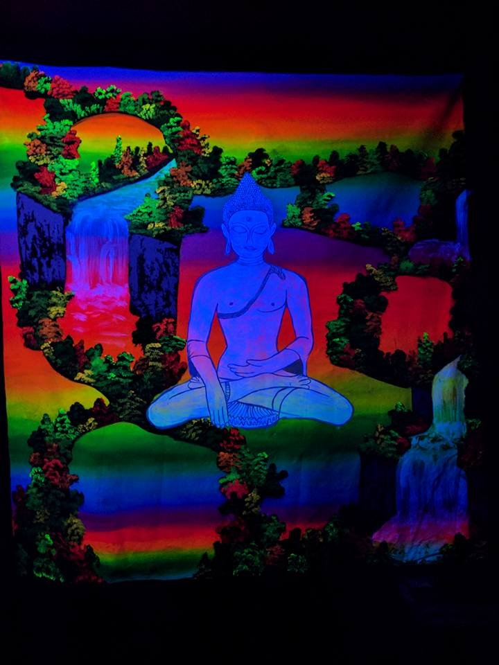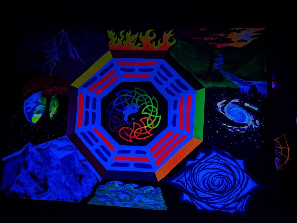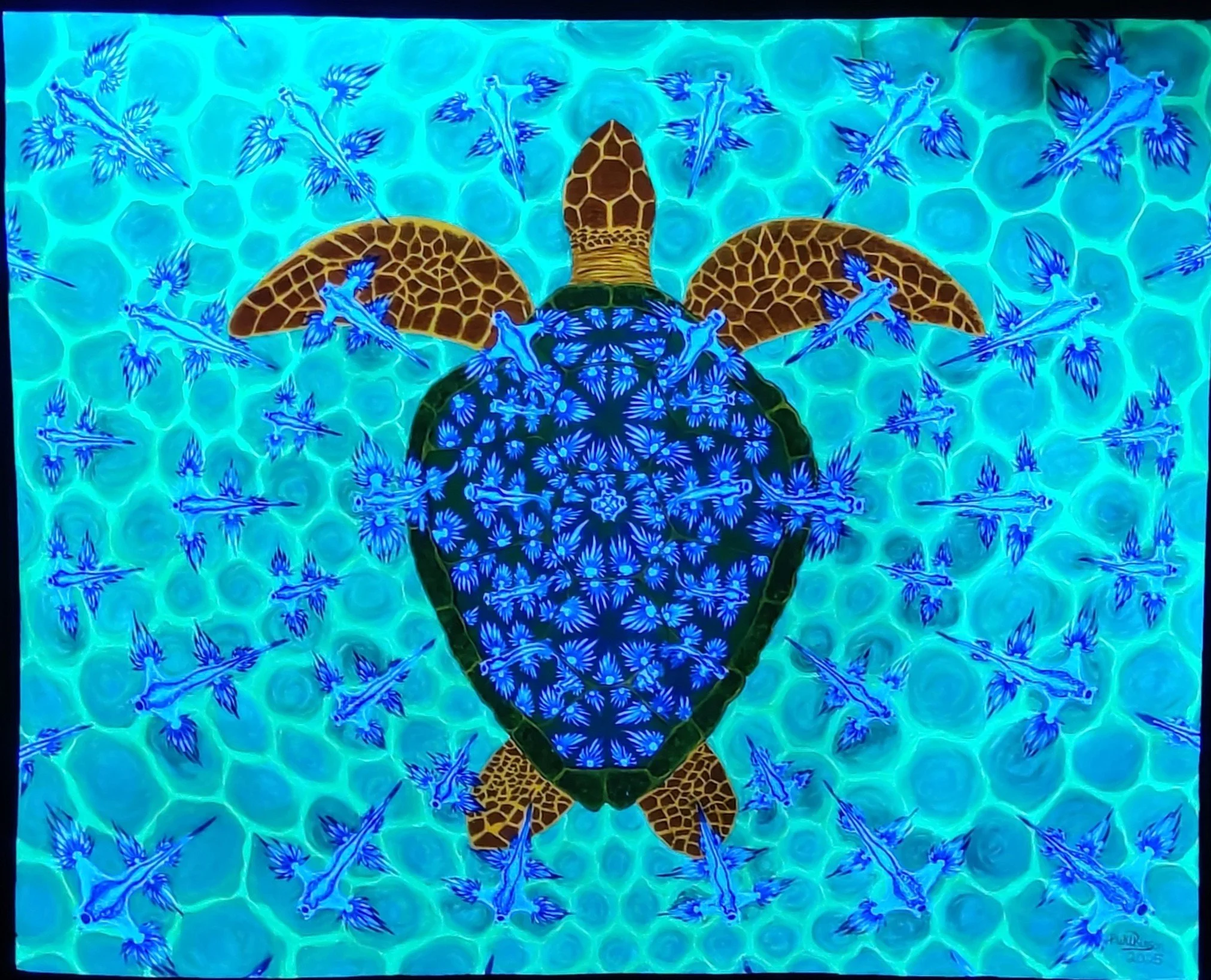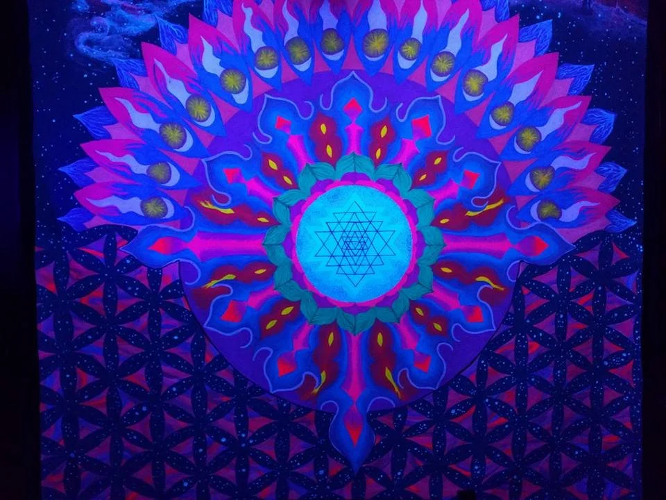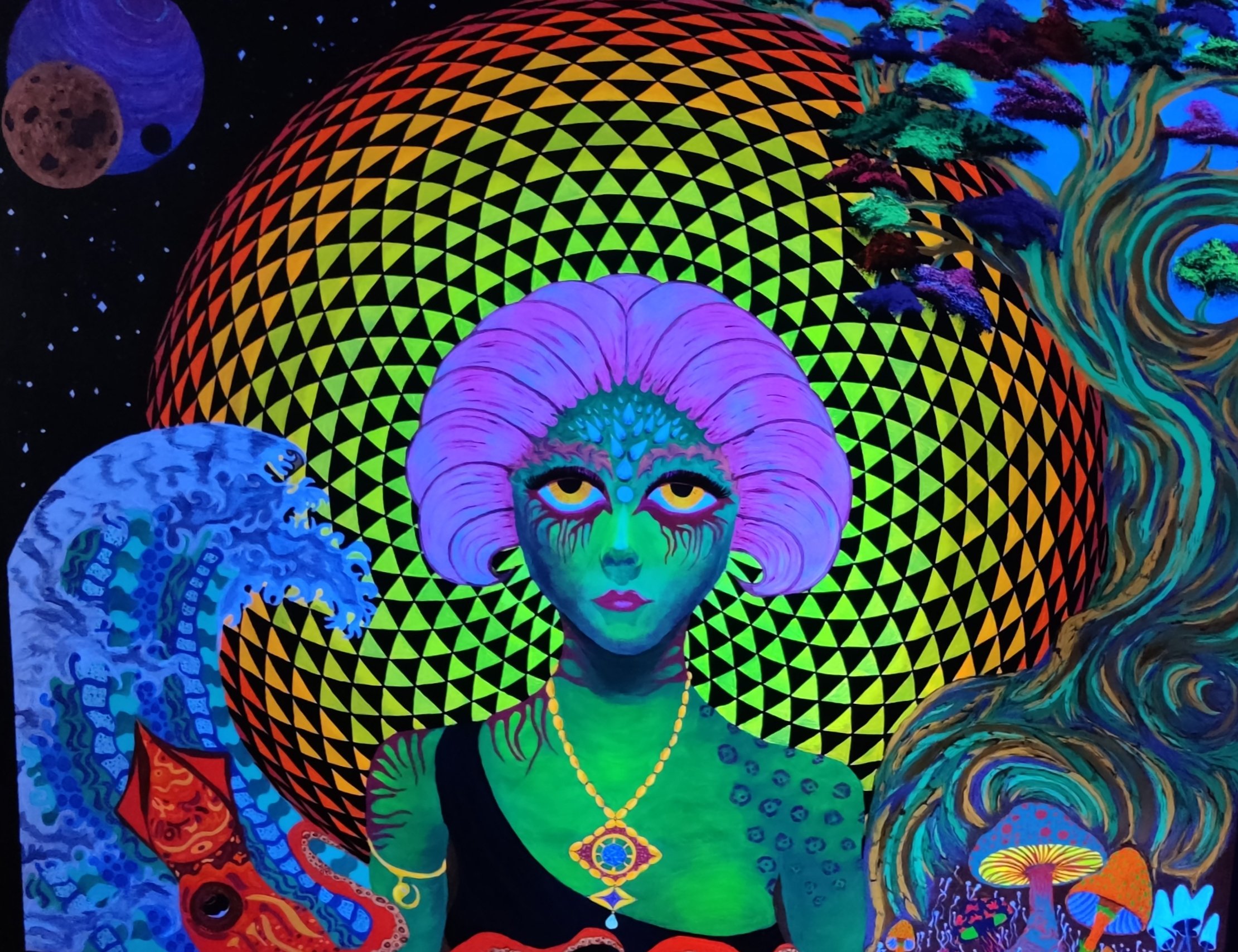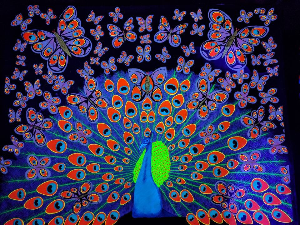 I work in both normal and UV light, moving between them to capture the dual nature of each piece. Inspiration can come from anywhere: nature, patterns, people, cultural moments. I have even created paintings based on personal questionnaires, weaving stories into glowing layers of colour.